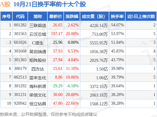 当日A股换手率前10大个股中8只个股收涨,平均涨幅12.23%,其中三联锻造(001282)以换手率54.07%排第一,6只个股近5个交易日中多次上榜。