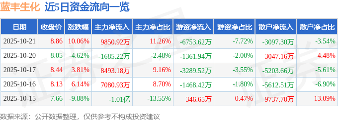 证券之星消息,蓝丰生化10月21日涨停收盘,收盘价8.86元。该股于14点1分涨停,未打开涨停,截止收盘封单资金为2848.21万元,占其流通市值1.21%。