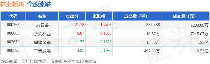 证券之星消息,10月21日林业板块较上一交易日下跌1.73%,平潭发展领跌。当日上证指数报收于3916.33,上涨1.36%。深证成指报收于13077.32,上涨2.06%。林业板块个股涨跌见下表: