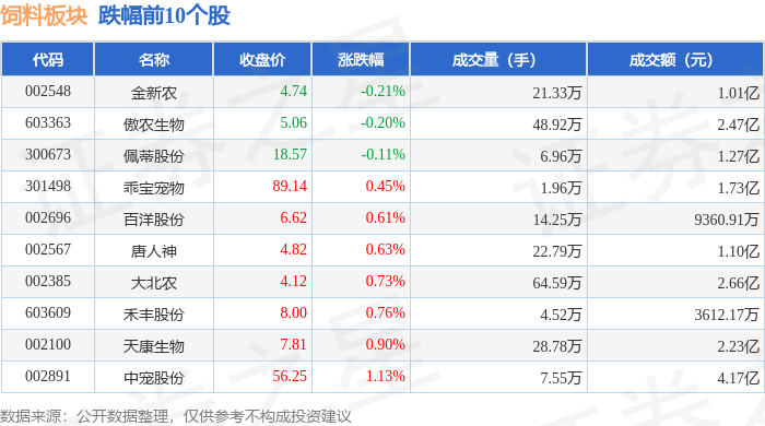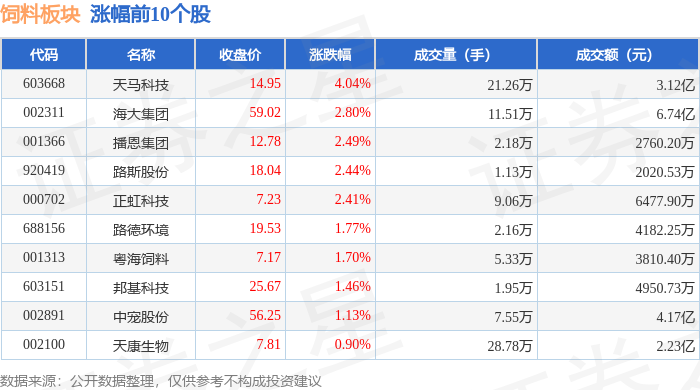证券之星消息,10月21日饲料板块较上一交易日上涨1.83%,天马科技领涨。当日上证指数报收于3916.33,上涨1.36%。深证成指报收于13077.32,上涨2.06%。饲料板块个股涨跌见下表: