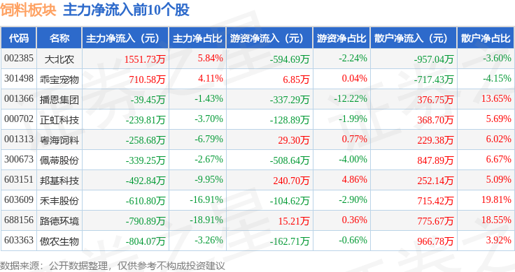 从资金流向上来看,当日饲料板块主力资金净流出1.51亿元,游资资金净流出2135.89万元,散户资金净流入1.73亿元。饲料板块个股资金流向见下表: