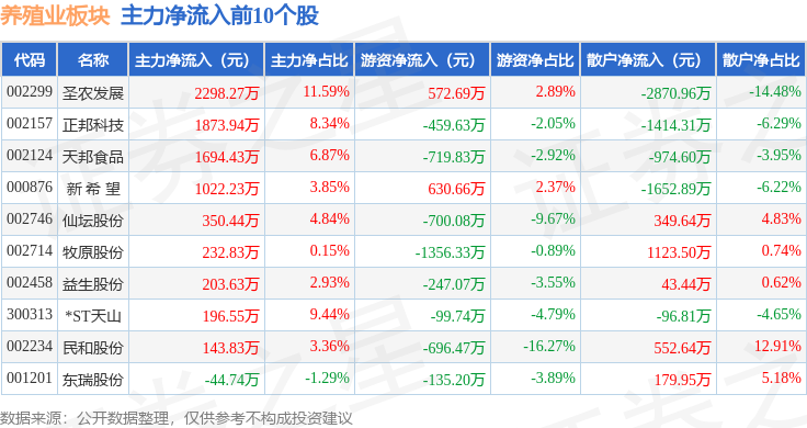 从资金流向上来看,当日养殖业板块主力资金净流出4444.89万元,游资资金净流出3576.77万元,散户资金净流入8021.66万元。养殖业板块个股资金流向见下表: