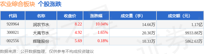 证券之星消息,10月21日农业综合板块较上一交易日上涨0.83%,润农节水领涨。当日上证指数报收于3916.33,上涨1.36%。深证成指报收于13077.32,上涨2.06%。农业综合板块个股涨跌见下表: