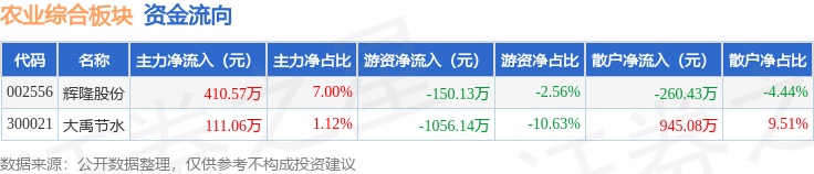 从资金流向上来看,当日农业综合板块主力资金净流入521.63万元,游资资金净流出1206.27万元,散户资金净流入684.64万元。农业综合板块个股资金流向见下表: