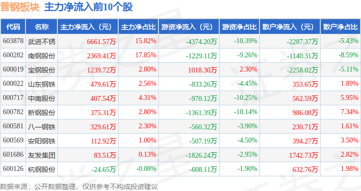 从资金流向上来看,当日普钢板块主力资金净流入909.38万元,游资资金净流出2.02亿元,散户资金净流入1.93亿元。普钢板块个股资金流向见下表:
