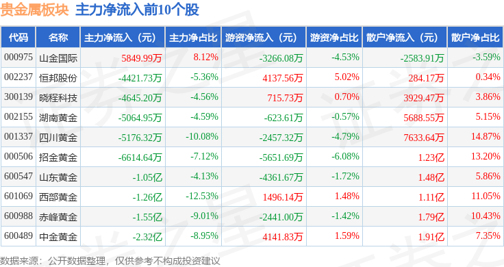 从资金流向上来看,当日贵金属板块主力资金净流出11.26亿元,游资资金净流出5679.98万元,散户资金净流入11.82亿元。贵金属板块个股资金流向见下表:
