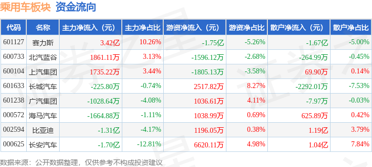 从资金流向上来看,当日乘用车板块主力资金净流入4748.25万元,游资资金净流出8523.07万元,散户资金净流入3774.83万元。乘用车板块个股资金流向见下表: