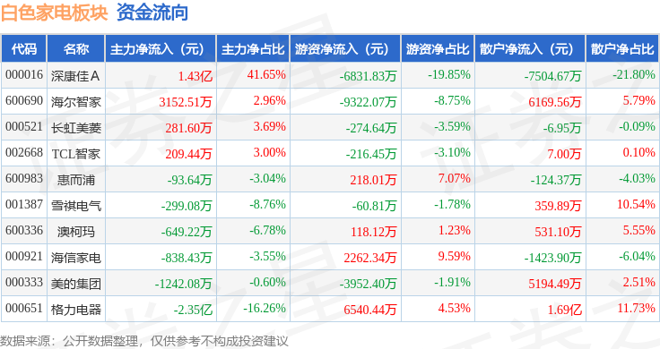 从资金流向上来看,当日白色家电板块主力资金净流出8599.42万元,游资资金净流出1.15亿元,散户资金净流入2.01亿元。白色家电板块个股资金流向见下表: