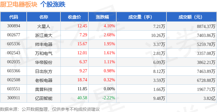 证券之星消息,10月21日厨卫电器板块较上一交易日上涨0.76%,火星人领涨。当日上证指数报收于3916.33,上涨1.36%。深证成指报收于13077.32,上涨2.06%。厨卫电器板块个股涨跌见下表: