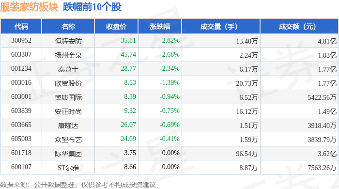 证券之星消息,10月21日服装家纺板块较上一交易日上涨1.38%,中胤时尚领涨。当日上证指数报收于3916.33,上涨1.36%。深证成指报收于13077.32,上涨2.06%。服装家纺板块个股涨跌见下表: