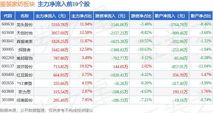从资金流向上来看,当日服装家纺板块主力资金净流出1.77亿元,游资资金净流出8286.89万元,散户资金净流入2.6亿元。服装家纺板块个股资金流向见下表: