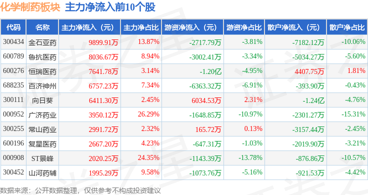 从资金流向上来看,当日化学制药板块主力资金净流出4.21亿元,游资资金净流出6.43亿元,散户资金净流入10.63亿元。化学制药板块个股资金流向见下表: