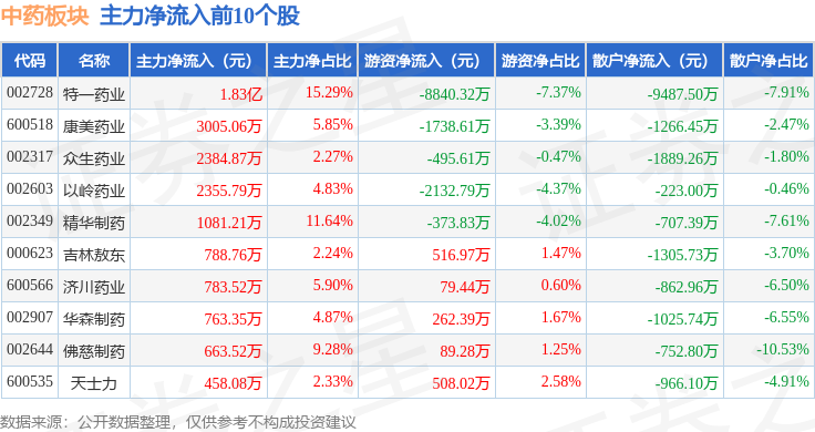 从资金流向上来看,当日中药板块主力资金净流出2.0亿元,游资资金净流出8578.59万元,散户资金净流入2.86亿元。中药板块个股资金流向见下表: