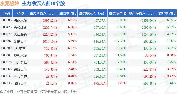 从资金流向上来看,当日水泥板块主力资金净流入2712.59万元,游资资金净流出6954.45万元,散户资金净流入4241.85万元。水泥板块个股资金流向见下表: