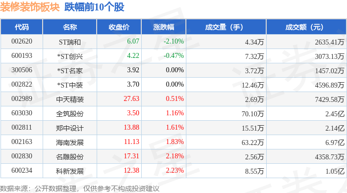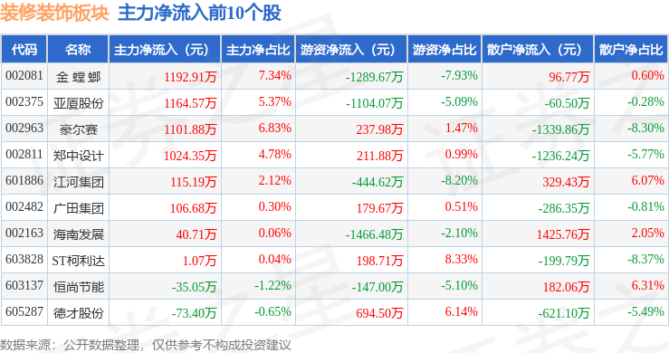从资金流向上来看,当日装修装饰板块主力资金净流出4929.18万元,游资资金净流出1465.51万元,散户资金净流入6394.69万元。装修装饰板块个股资金流向见下表: