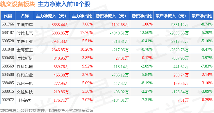 从资金流向上来看,当日轨交设备板块主力资金净流入8367.9万元,游资资金净流出7227.43万元,散户资金净流出1140.46万元。轨交设备板块个股资金流向见下表: