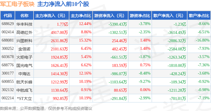 从资金流向上来看,当日军工电子板块主力资金净流出5813.63万元,游资资金净流入8258.44万元,散户资金净流出2444.8万元。军工电子板块个股资金流向见下表: