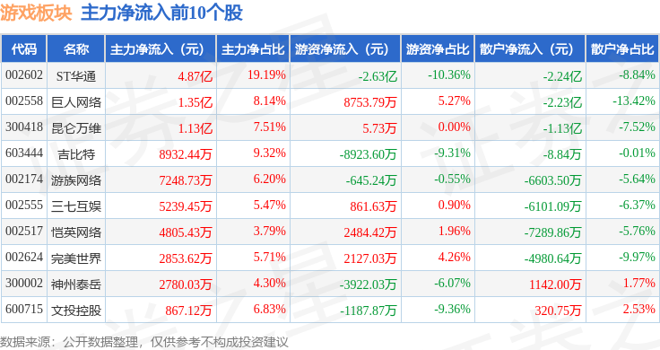 从资金流向上来看,当日游戏板块主力资金净流入9.65亿元,游资资金净流出2.26亿元,散户资金净流出7.39亿元。游戏板块个股资金流向见下表: