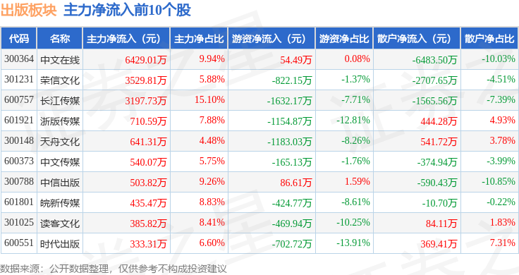 从资金流向上来看,当日出版板块主力资金净流入7757.61万元,游资资金净流出4576.36万元,散户资金净流出3181.24万元。出版板块个股资金流向见下表: