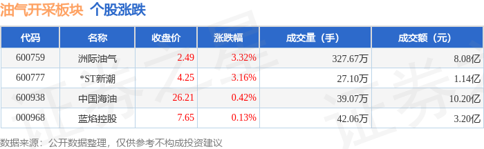 证券之星消息,10月21日油气开采板块较上一交易日上涨1.23%,洲际油气领涨。当日上证指数报收于3916.33,上涨1.36%。深证成指报收于13077.32,上涨2.06%。油气开采板块个股涨跌见下表: