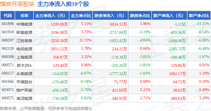 从资金流向上来看,当日煤炭开采板块主力资金净流出10.1亿元,游资资金净流入4.83亿元,散户资金净流入5.28亿元。煤炭开采板块个股资金流向见下表:
