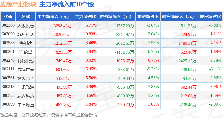 从资金流向上来看,当日应急产业板块主力资金净流出1.73亿元,游资资金净流出2.69亿元,散户资金净流入4.42亿元。应急产业板块个股资金流向见下表: