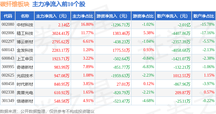 从资金流向上来看,当日碳纤维板块主力资金净流出1.33亿元,游资资金净流出0.97万元,散户资金净流入1.33亿元。碳纤维板块个股资金流向见下表:
