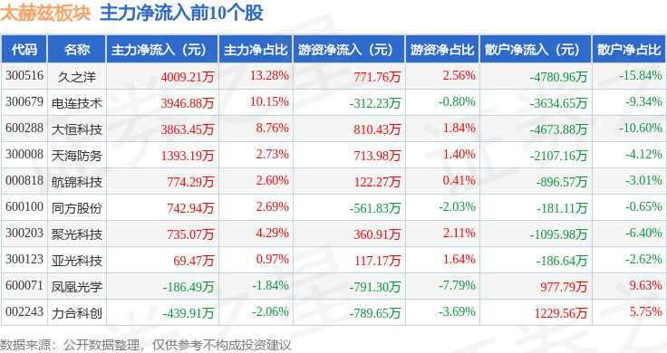 从资金流向上来看,当日太赫兹板块主力资金净流出6.41亿元,游资资金净流入1.35亿元,散户资金净流入5.07亿元。太赫兹板块个股资金流向见下表: