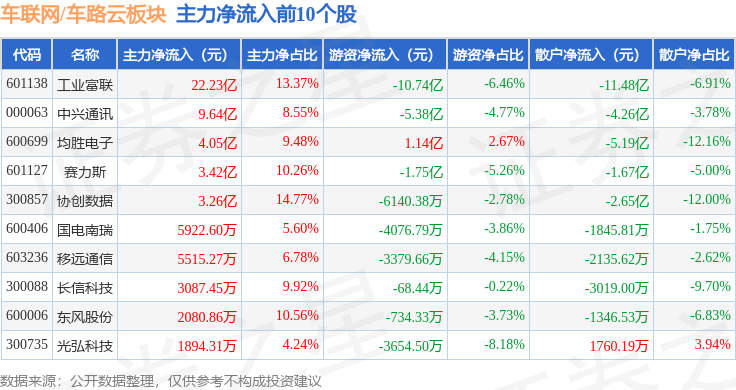 从资金流向上来看,当日车联网/车路云板块主力资金净流入32.13亿元,游资资金净流出23.53亿元,散户资金净流出8.6亿元。车联网/车路云板块个股资金流向见下表: