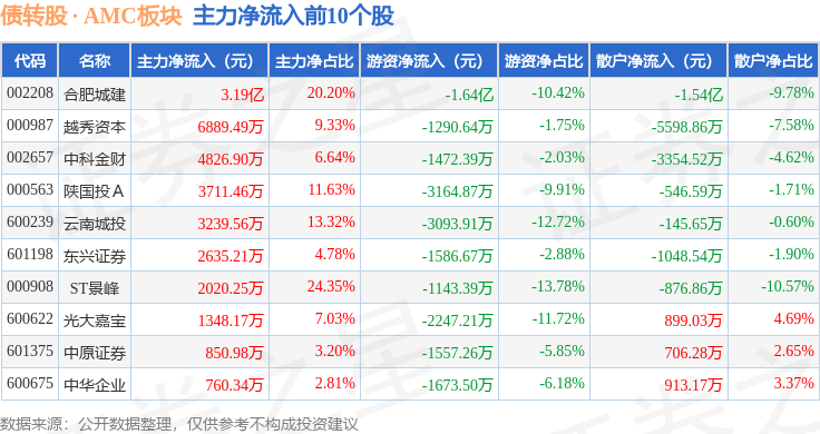 从资金流向上来看,当日债转股 · AMC板块主力资金净流入4.56亿元,游资资金净流出4.8亿元,散户资金净流入2380.87万元。债转股 · AMC板块个股资金流向见下表: