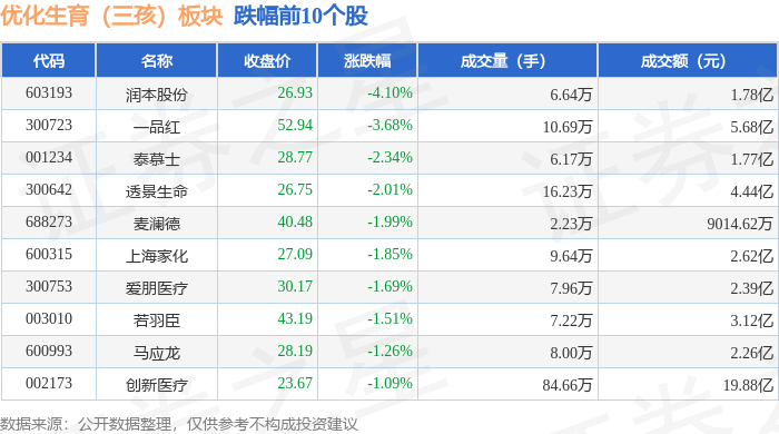 从资金流向上来看,当日优化生育(三孩)板块主力资金净流出4.08亿元,游资资金净流出2.43亿元,散户资金净流入6.51亿元。优化生育(三孩)板块个股资金流向见下表: