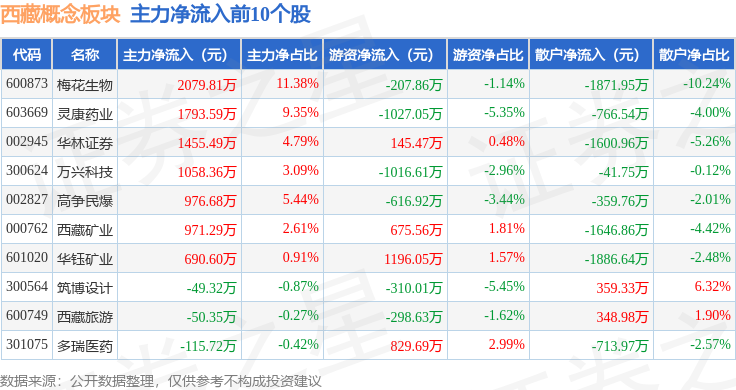 从资金流向上来看,当日西藏概念板块主力资金净流出1748.81万元,游资资金净流出2407.42万元,散户资金净流入4156.22万元。西藏概念板块个股资金流向见下表:
