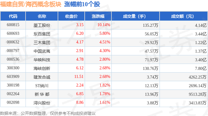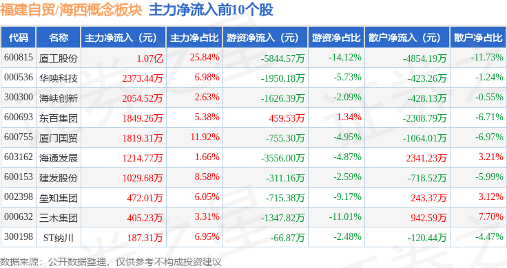 从资金流向上来看,当日福建自贸/海西概念板块主力资金净流出5916.85万元,游资资金净流出2.28亿元,散户资金净流入2.87亿元。福建自贸/海西概念板块个股资金流向见下表: