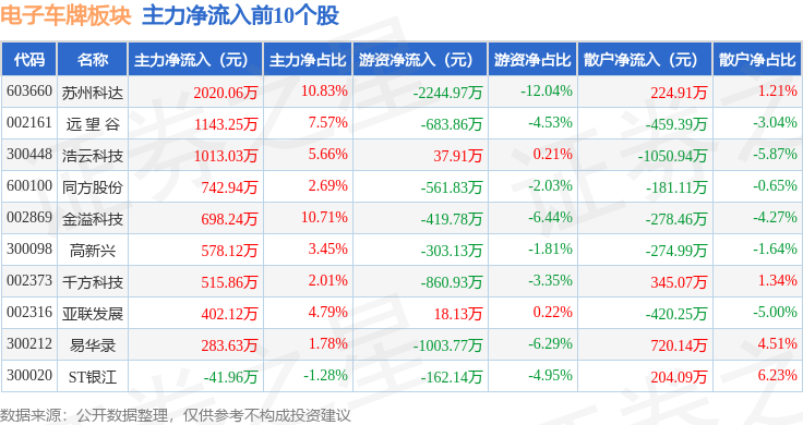 从资金流向上来看,当日电子车牌板块主力资金净流出2.16亿元,游资资金净流入6086.18万元,散户资金净流入1.55亿元。电子车牌板块个股资金流向见下表: