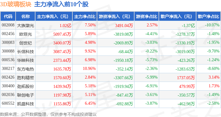 从资金流向上来看,当日3D玻璃板块主力资金净流入3552.77万元,游资资金净流出1.27亿元,散户资金净流入9168.38万元。3D玻璃板块个股资金流向见下表: