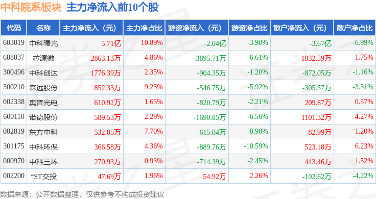从资金流向上来看,当日中科院系板块主力资金净流入5.87亿元,游资资金净流出3.19亿元,散户资金净流出2.68亿元。中科院系板块个股资金流向见下表: