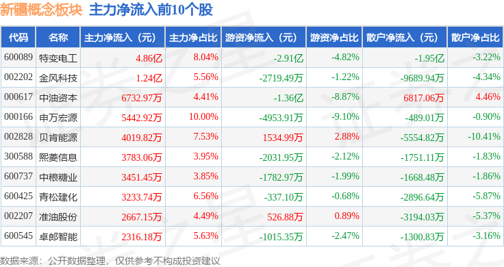 从资金流向上来看,当日新疆概念板块主力资金净流入2.68亿元,游资资金净流出5.56亿元,散户资金净流入2.88亿元。新疆概念板块个股资金流向见下表: