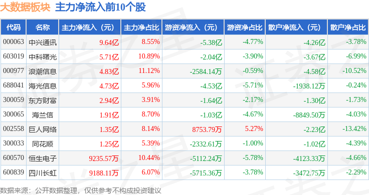 从资金流向上来看,当日大数据板块主力资金净流入28.46亿元,游资资金净流出22.95亿元,散户资金净流出5.51亿元。大数据板块个股资金流向见下表: