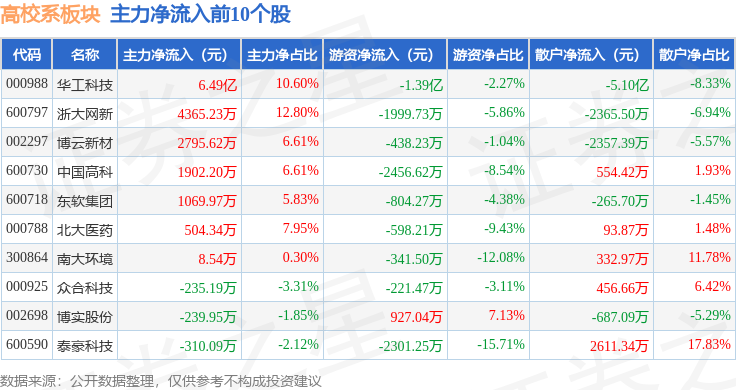 从资金流向上来看,当日高校系板块主力资金净流入5.29亿元,游资资金净流出3.43亿元,散户资金净流出1.86亿元。高校系板块个股资金流向见下表: