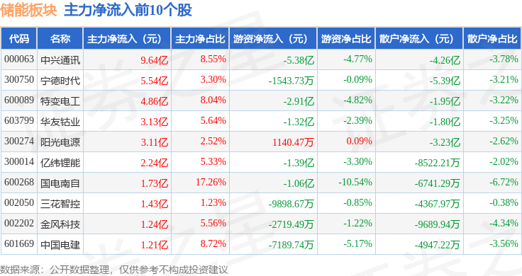 从资金流向上来看,当日储能板块主力资金净流入31.9亿元,游资资金净流出20.8亿元,散户资金净流出11.11亿元。储能板块个股资金流向见下表: