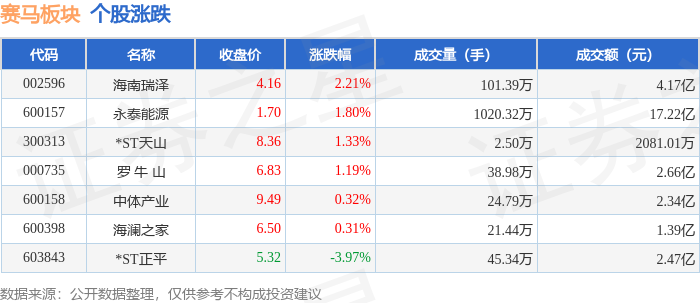 证券之星消息,10月21日赛马板块较上一交易日上涨0.89%,海南瑞泽领涨。当日上证指数报收于3916.33,上涨1.36%。深证成指报收于13077.32,上涨2.06%。赛马板块个股涨跌见下表: