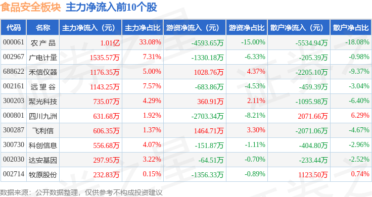 从资金流向上来看,当日食品安全板块主力资金净流出654.96万元,游资资金净流出4593.62万元,散户资金净流入5248.58万元。食品安全板块个股资金流向见下表: