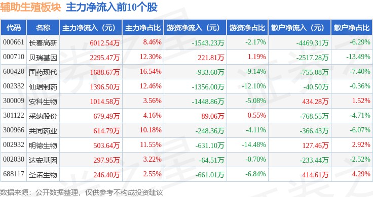 从资金流向上来看,当日辅助生殖板块主力资金净流入2608.1万元,游资资金净流出1.06亿元,散户资金净流入8031.5万元。辅助生殖板块个股资金流向见下表:
