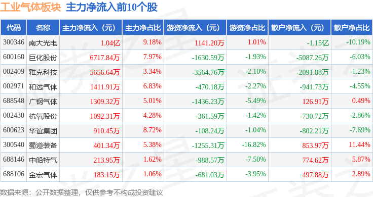 从资金流向上来看,当日工业气体板块主力资金净流入7170.63万元,游资资金净流出1.36亿元,散户资金净流入6390.26万元。工业气体板块个股资金流向见下表: