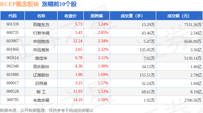 证券之星消息,10月21日RCEP概念板块较上一交易日上涨1.22%,百隆东方领涨。当日上证指数报收于3916.33,上涨1.36%。深证成指报收于13077.32,上涨2.06%。RCEP概念板块个股涨跌见下表: