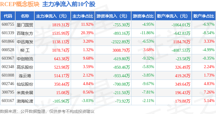 从资金流向上来看,当日RCEP概念板块主力资金净流出5104.3万元,游资资金净流出6928.74万元,散户资金净流入1.2亿元。RCEP概念板块个股资金流向见下表:
