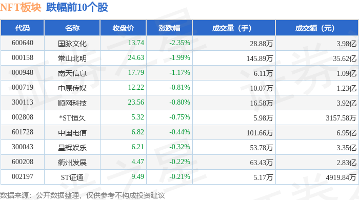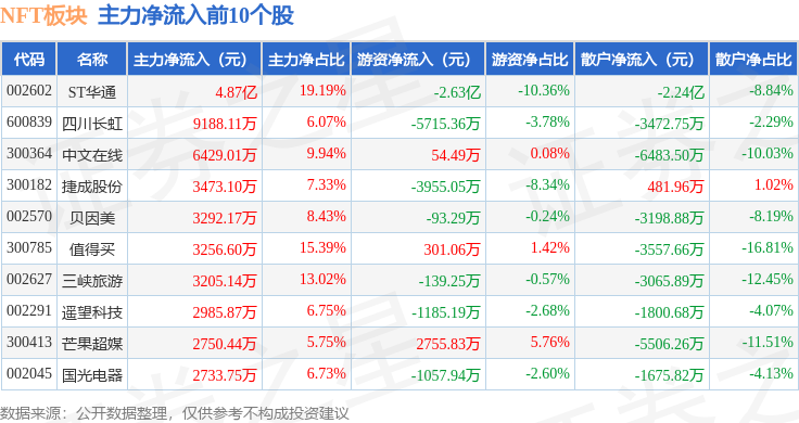 从资金流向上来看,当日NFT板块主力资金净流入4.92亿元,游资资金净流出4.16亿元,散户资金净流出7592.9万元。NFT板块个股资金流向见下表: