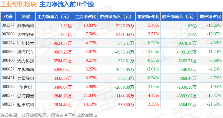 从资金流向上来看,当日工业母机板块主力资金净流入3.97亿元,游资资金净流出6108.6万元,散户资金净流出3.36亿元。工业母机板块个股资金流向见下表: