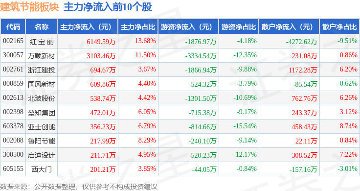 从资金流向上来看,当日建筑节能板块主力资金净流出2144.32万元,游资资金净流出1.39亿元,散户资金净流入1.6亿元。建筑节能板块个股资金流向见下表: