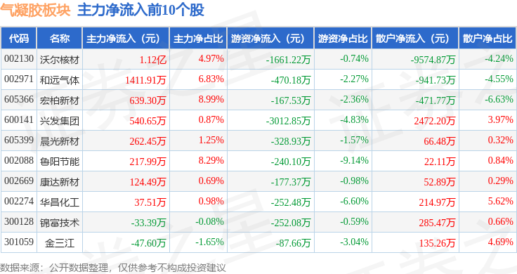 从资金流向上来看,当日气凝胶板块主力资金净流入9970.04万元,游资资金净流出8542.0万元,散户资金净流出1428.04万元。气凝胶板块个股资金流向见下表: